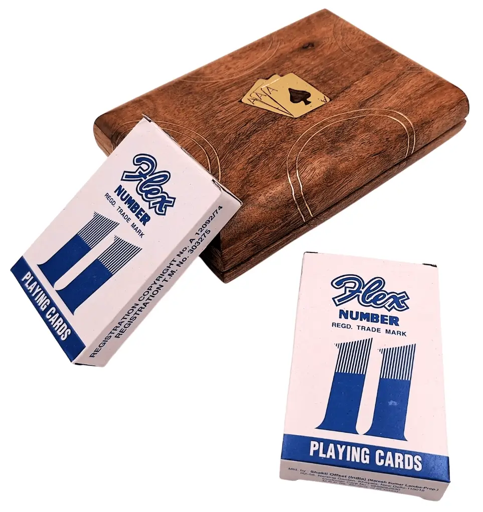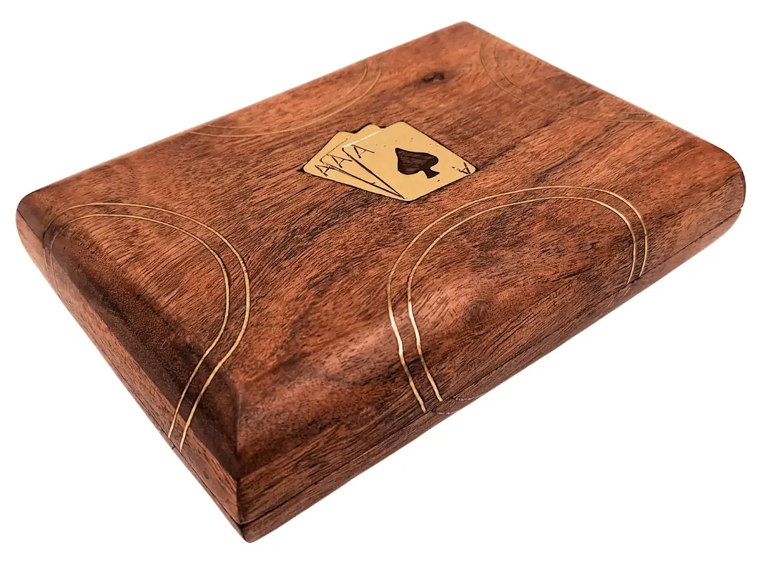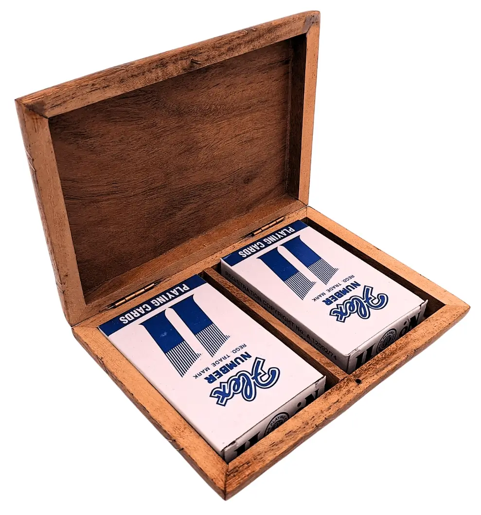 ➡️ Praktyczny design i funkcjonalność – pudełko z naturalnego drewna i mosiężnymi zdobieniami chroni karty i pomaga utrzymać porządek. W środku znajdują się dwie talie, dzięki którym możesz grać w wiele gier i cieszyć się rozgrywką w większym gronie.