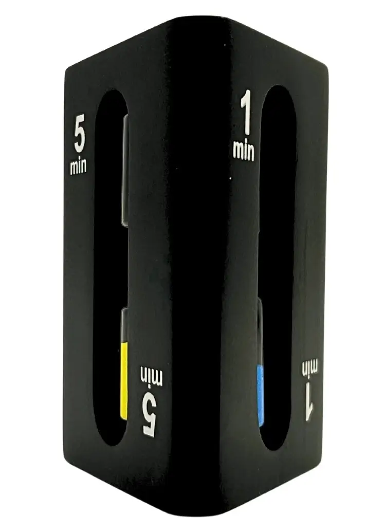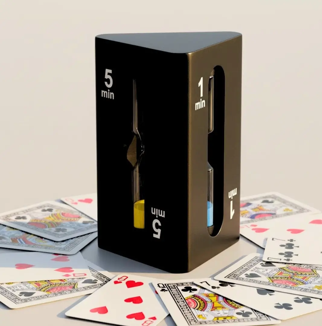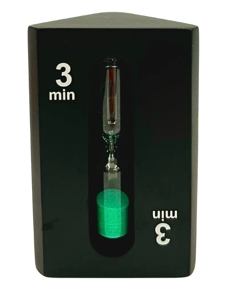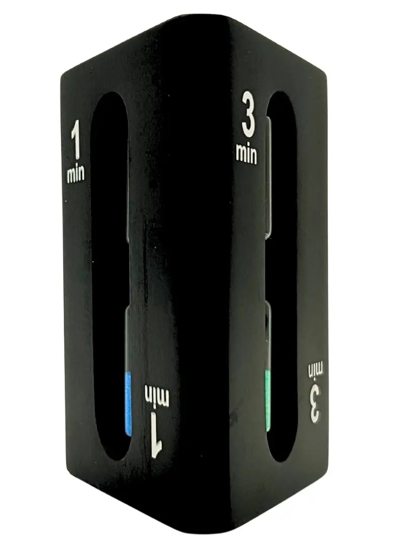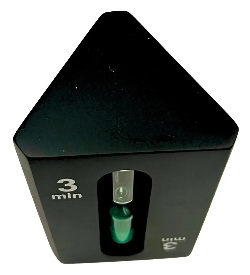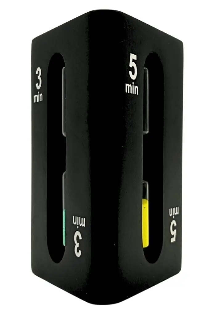 ➡️ Nowoczesna trójstronna klepsydra łączy elegancję z funkcjonalnością. W jednej zwartej bryle znajdują się trzy osobne klepsydry odmierzające 1, 3 i 5 minut, co pozwala intuicyjnie kontrolować krótki czas bez użycia elektroniki.