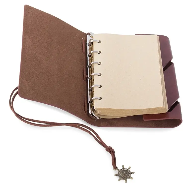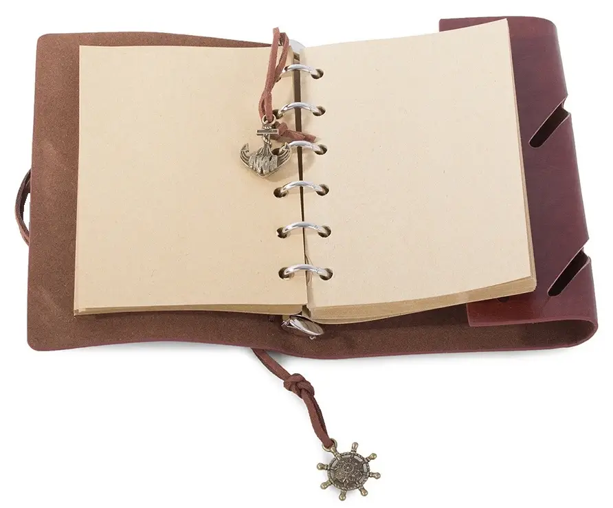 ➡️ Wyposażony w twardą oprawę ze skóry ekologicznej i wymienne kartki, notes zapewnia długotrwałe użytkowanie. 70 kartek wpinanych w sześć metalowych ringów, rzemień do zawiązywania oraz kompaktowe wymiary (15 × 10 cm) czynią go wygodnym i praktycznym akcesorium do przenoszenia w torbie czy plecaku.