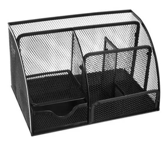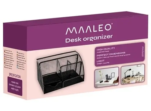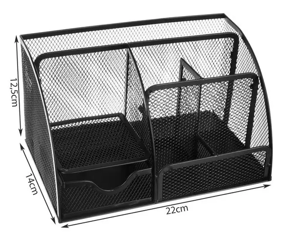 ➡️ Organizer jest wykonany z trwałego żelaza, dzięki czemu posłuży Ci przez długi czas. Posiada jedną dużą przegródkę, cztery mniejsze, półkę oraz szufladkę, które pomieszczą wszystkie niezbędne artykuły biurowe. Funkcjonalny design pozwala zachować porządek i utrzymać estetykę miejsca pracy.
