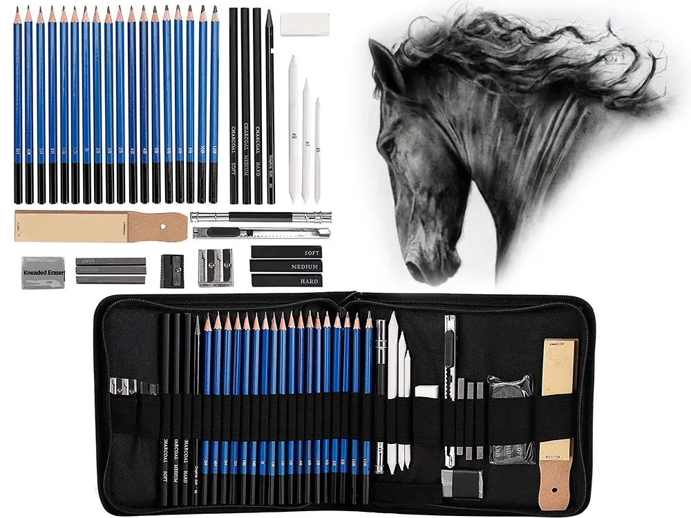 ➡️ Zestaw zawiera ołówki o różnej twardości, węgiel w drewnie i sztyfcie, blendery, gumki, temperówki, przedłużkę i papier ścierny – wszystko w solidnym etui z suwakiem i praktyczną rączką do przenoszenia. Naturalne drewno i wysokiej jakości materiały zapewniają trwałość, a ergonomiczne rozwiązania pozwalają w pełni wykorzystać każdy element zestawu.