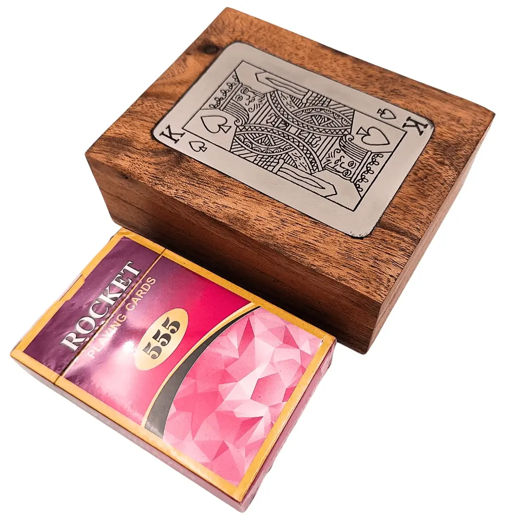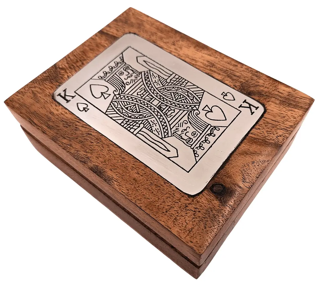 ➡️ Klasyczna talia kart w eleganckiej oprawie – zamknięta w drewnianym pudełku z dekoracyjną plakietką króla przyciąga wzrok i nadaje rozgrywce wyjątkowy charakter. To połączenie ponadczasowej zabawy i stylowego dodatku do wnętrza.